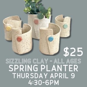 Spring into spring with a lovely handbuilt planter. During this class participants of all ages will be guided through a project that can be completed in 1.5 hours. Each Class will begin with a 5-10 minute educational moment specific to the project and students will make their own unique piece. This class is for all ages, however participating adults need to accompany children.