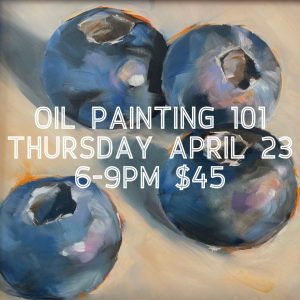 Learn oil painting in this evening workshop, focusing on color theory and brushstroke, with an emphasis on color mixing, while painting still life blueberries. No experience is necessary. Come create in a fun atmosphere! Students will use water-mixable oil paints on a small stretched canvas. All supplies included. Don’t wear nice clothes. Aprons available. Please feel free to brings snacks. The Inspiration Bar can be open.