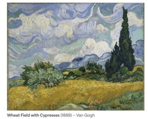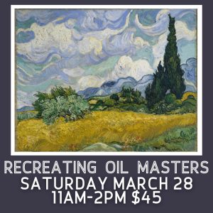 Recreate your own version of Vincent van Gogh’s famous oil masterpiece, Wheat Field with Cypress. Learn a little history about the Artist, and principles of art basics, while oil painting your way through the piece. Experimentation with coloring and style encouraged! Students will use water-mixable oil paints on a stretched canvas. All supplies included. Don’t wear nice clothes. Aprons available. Oil painting experience not necessary, though may be helpful.