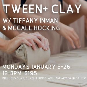 Just for homeschooled tweens and above! Does your homeschool tween or teen need an art outlet? This clay class will teach both handbuilding and wheel throwing skills, with students able to get creative. Includes 12 hours of instruction, a 25 lb bag of clay, glaze and firings, and January Open Studio access. Students are welcomed to any Open Studio time, though McCall and Tiffany will be available for extra instruction on their days, Thursday 10-2 and Friday 9-1.